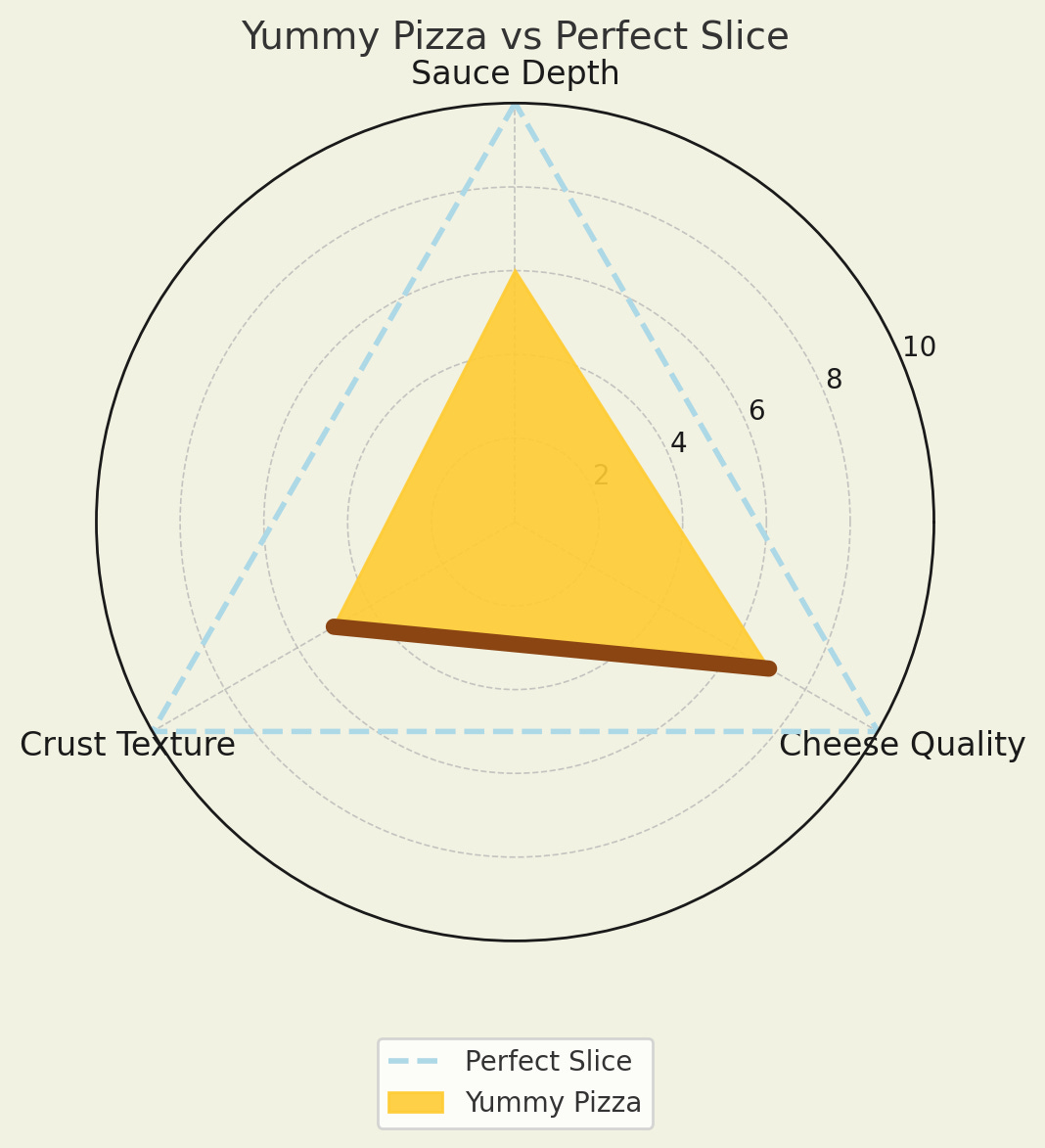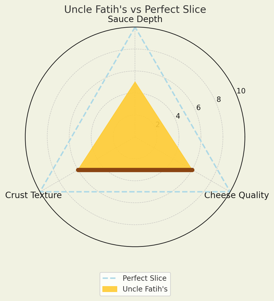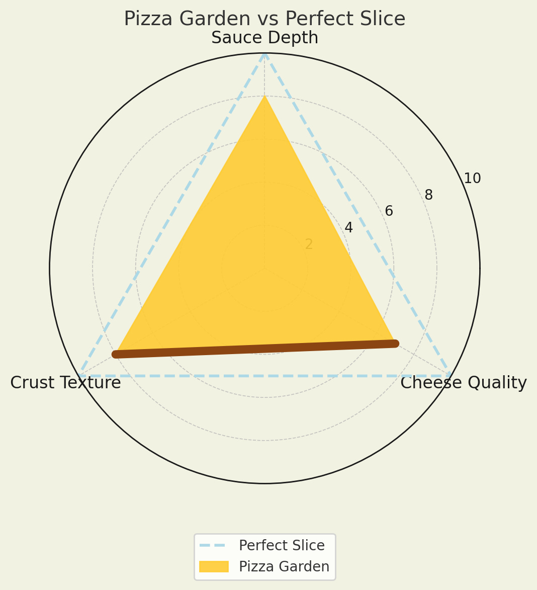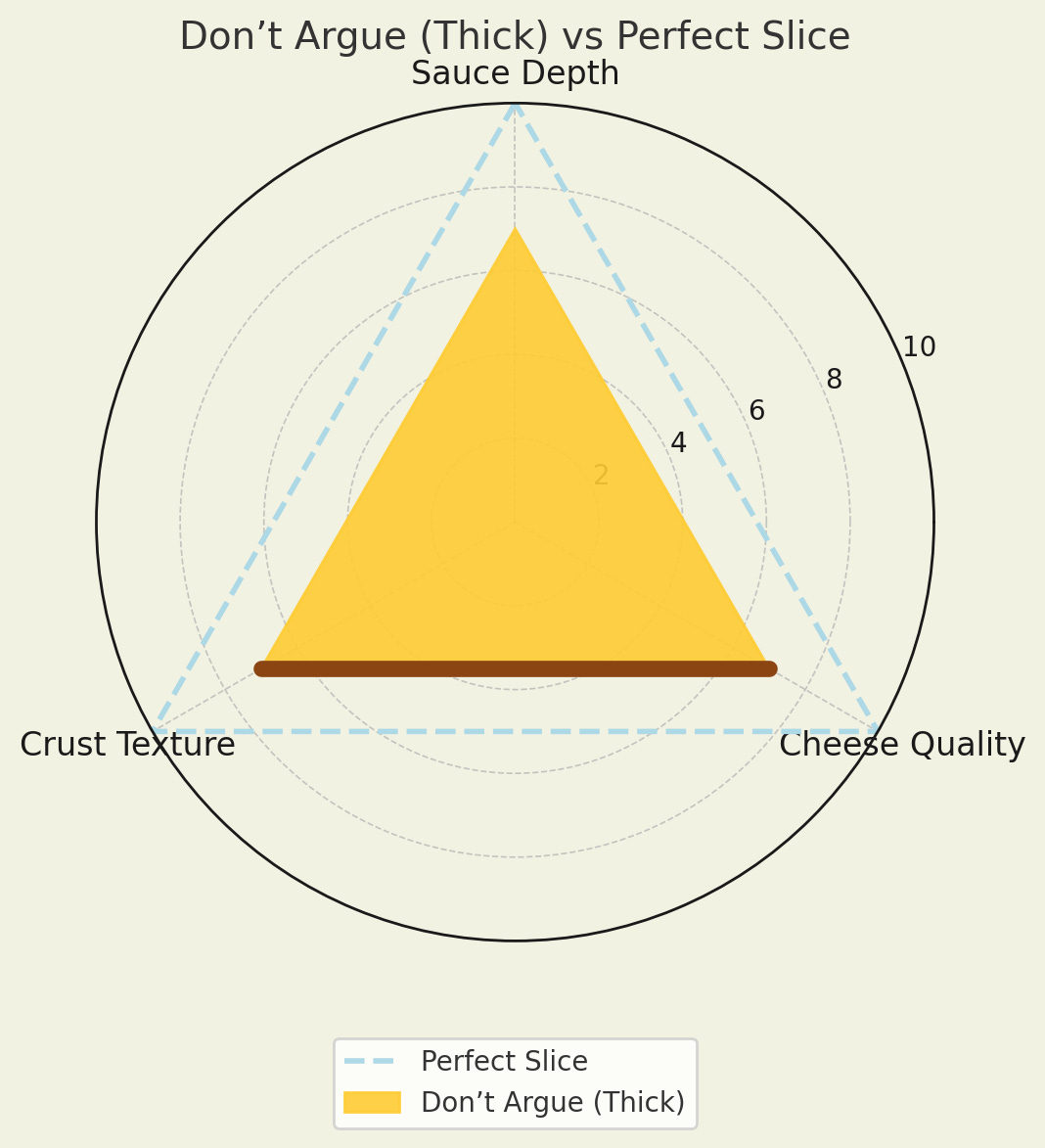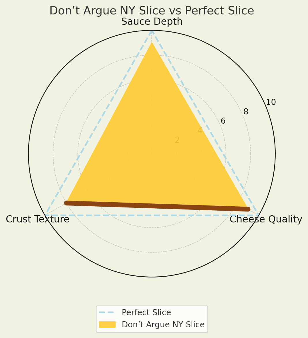 Each chart shows my assessment of cheese, sauce, and crust, with an overlay of my “perfect slice” for comparison.
