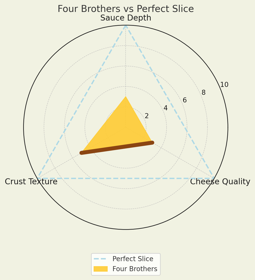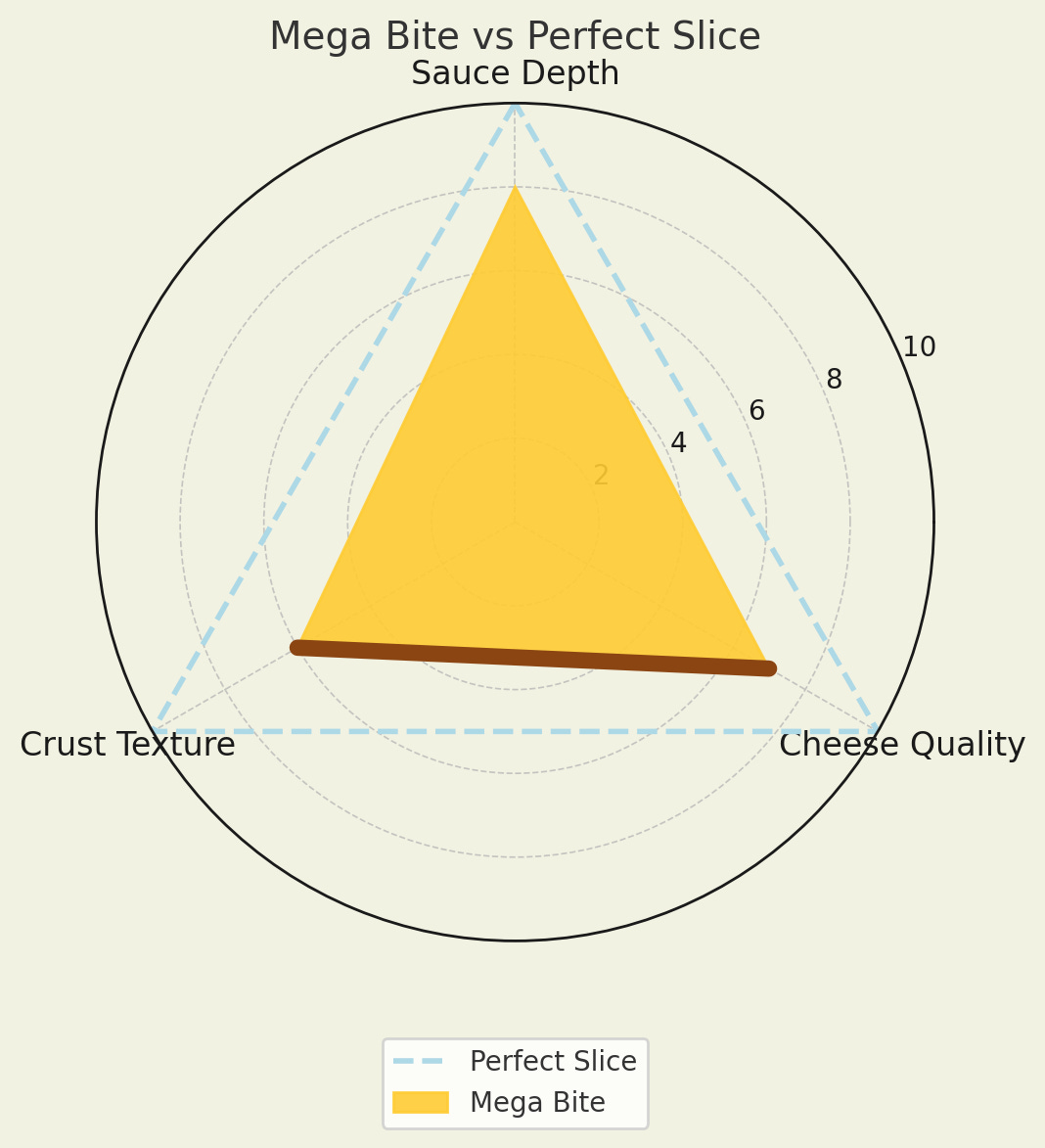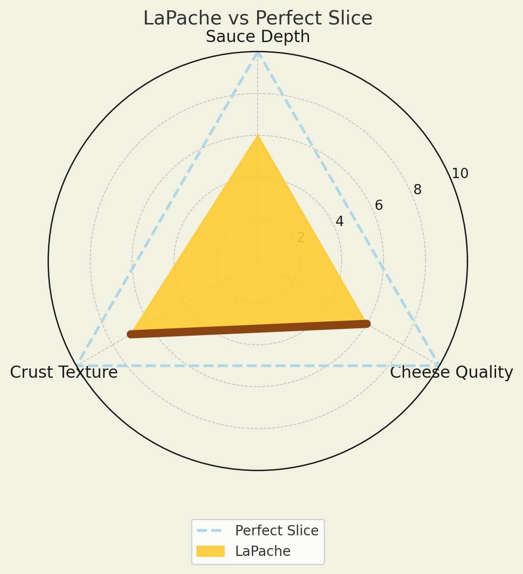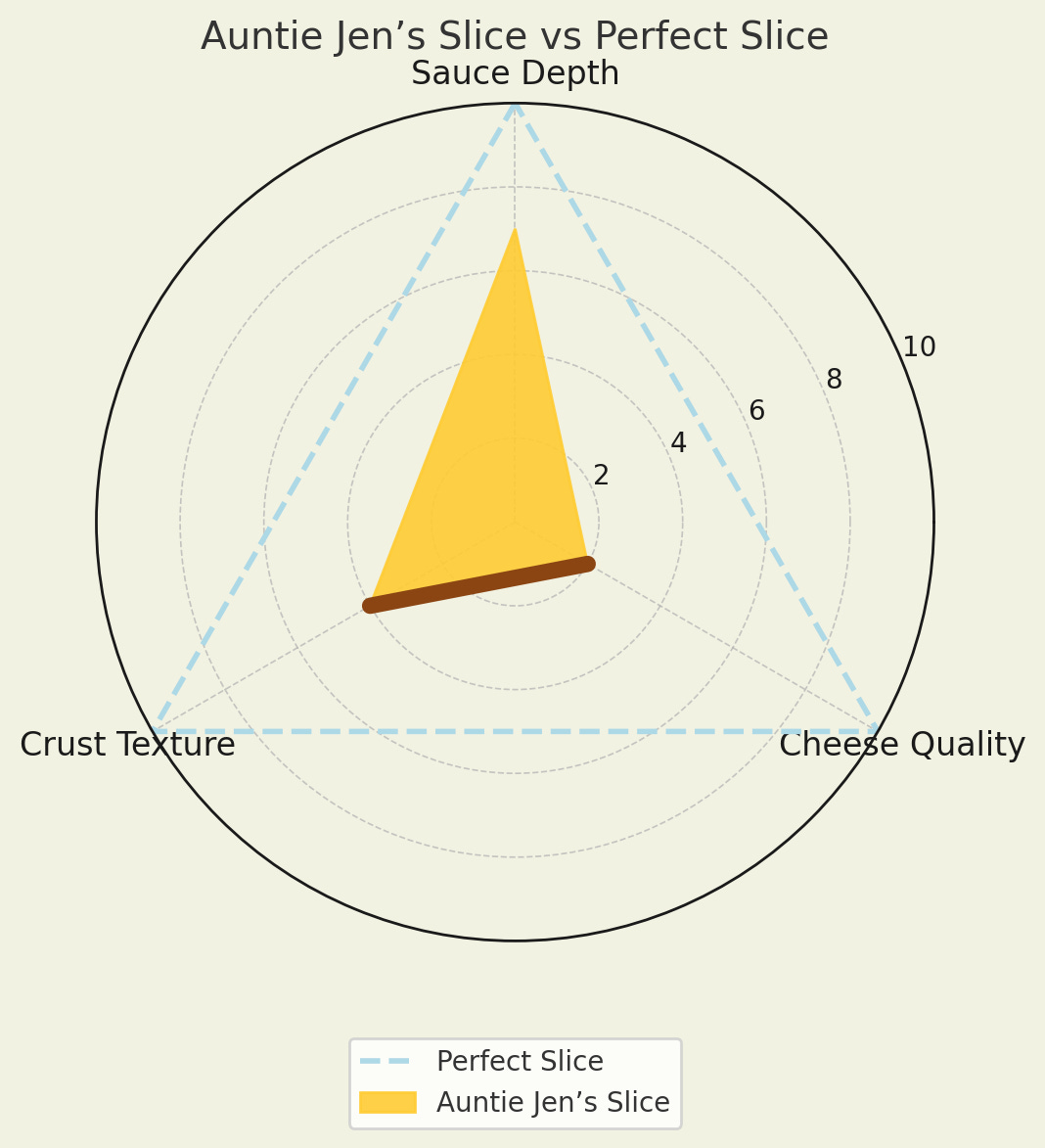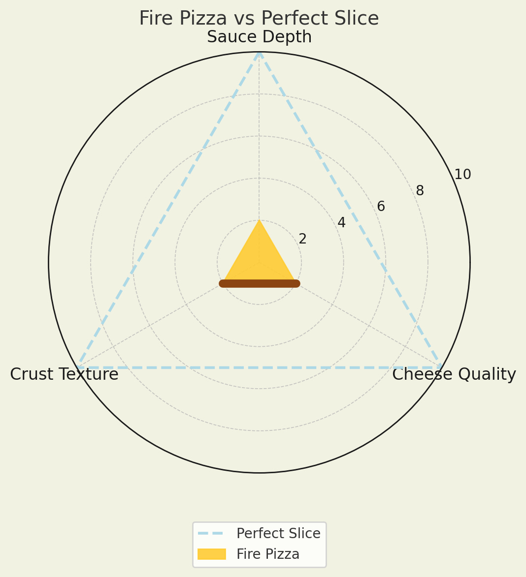 Each chart shows my assessment of cheese, sauce, and crust, with an overlay of my “perfect slice” for comparison.