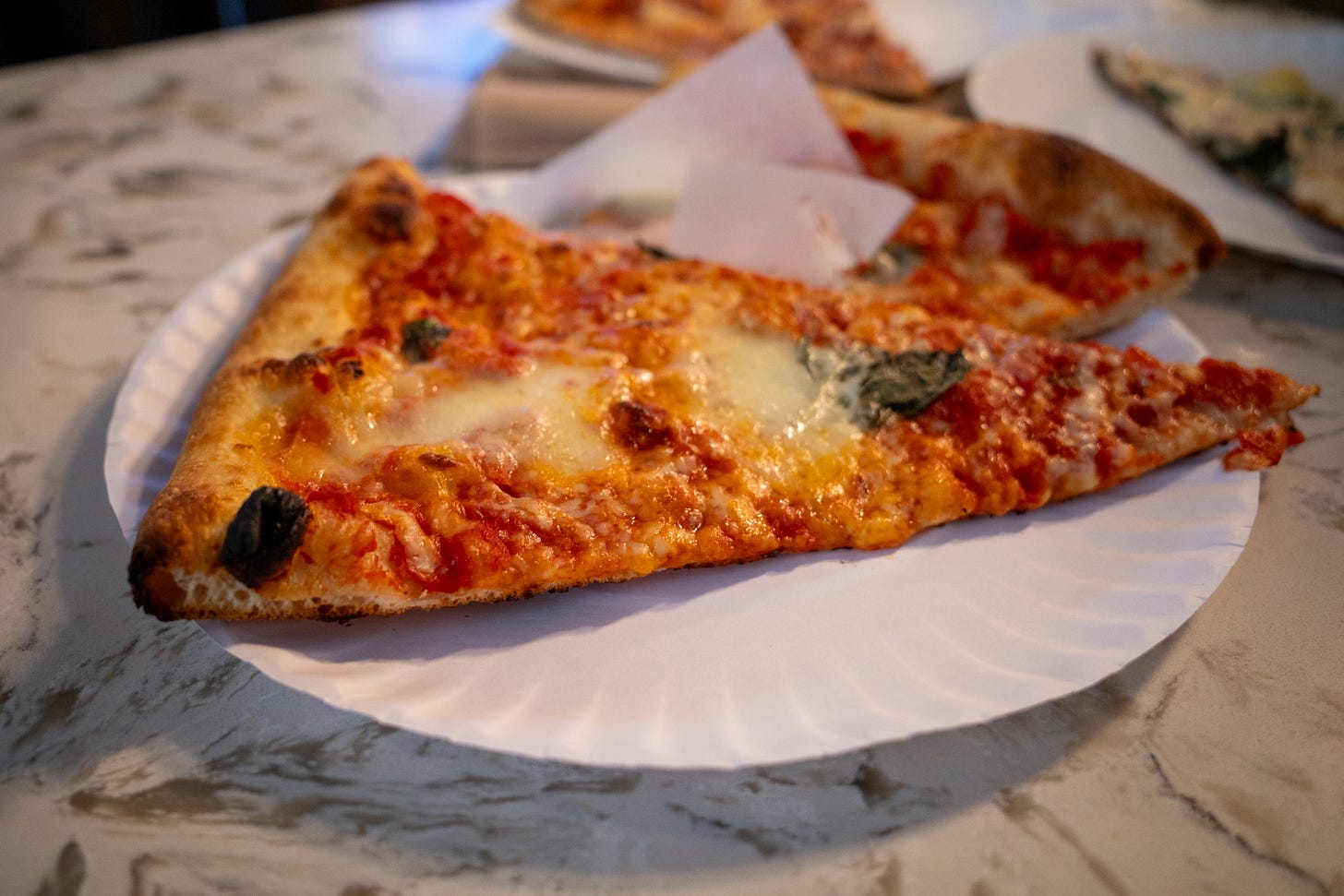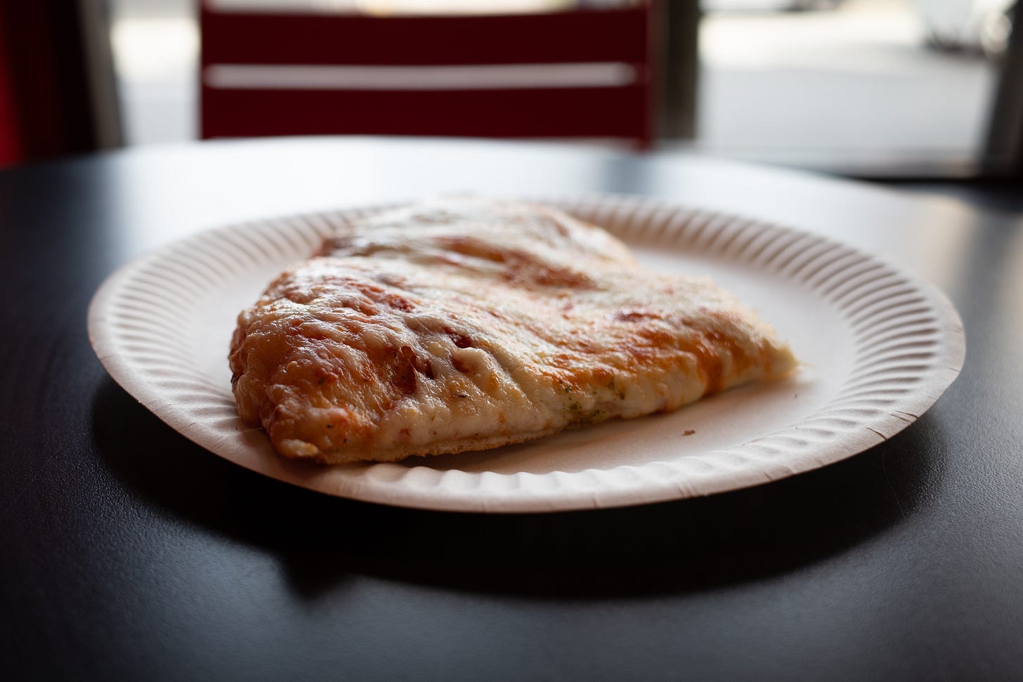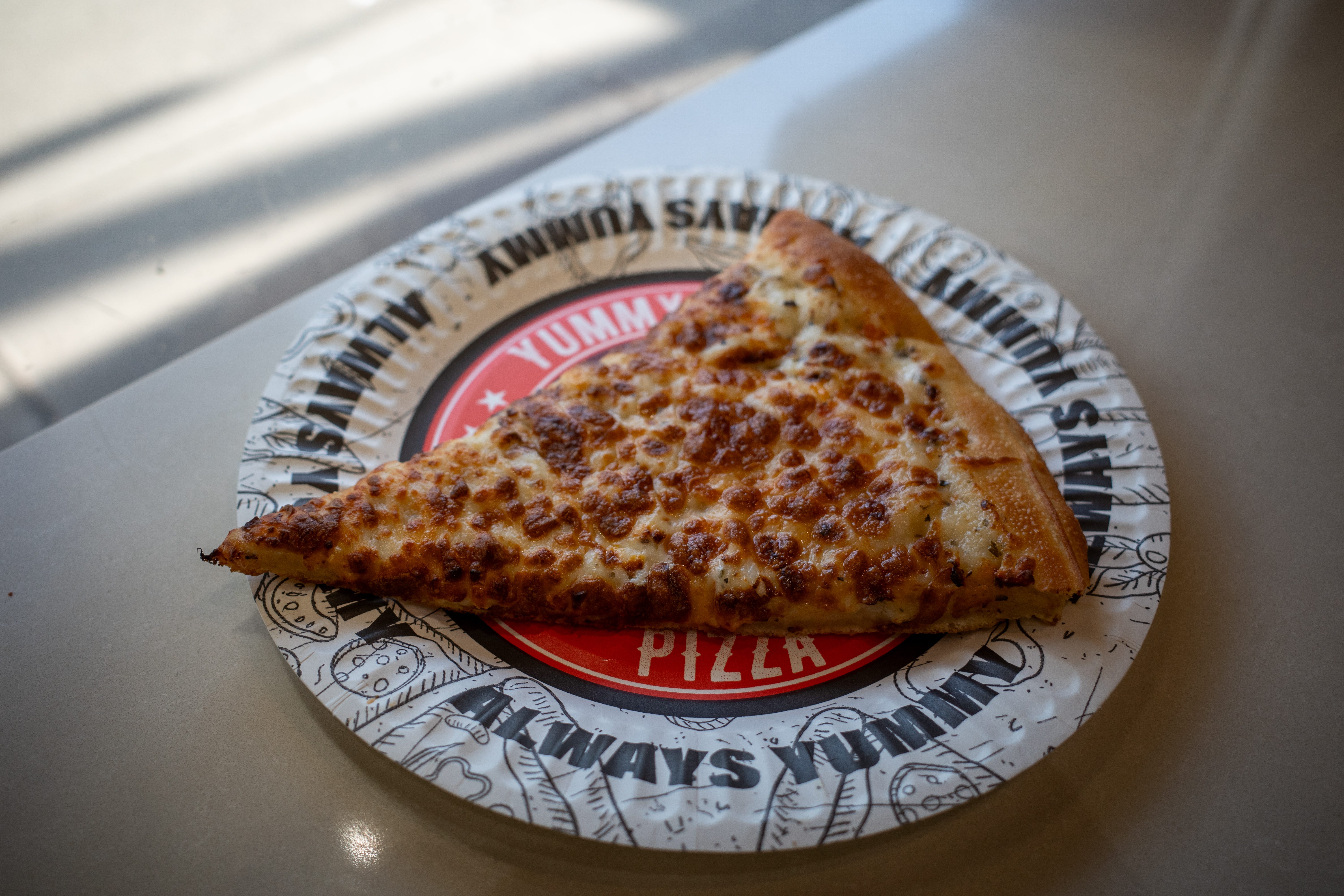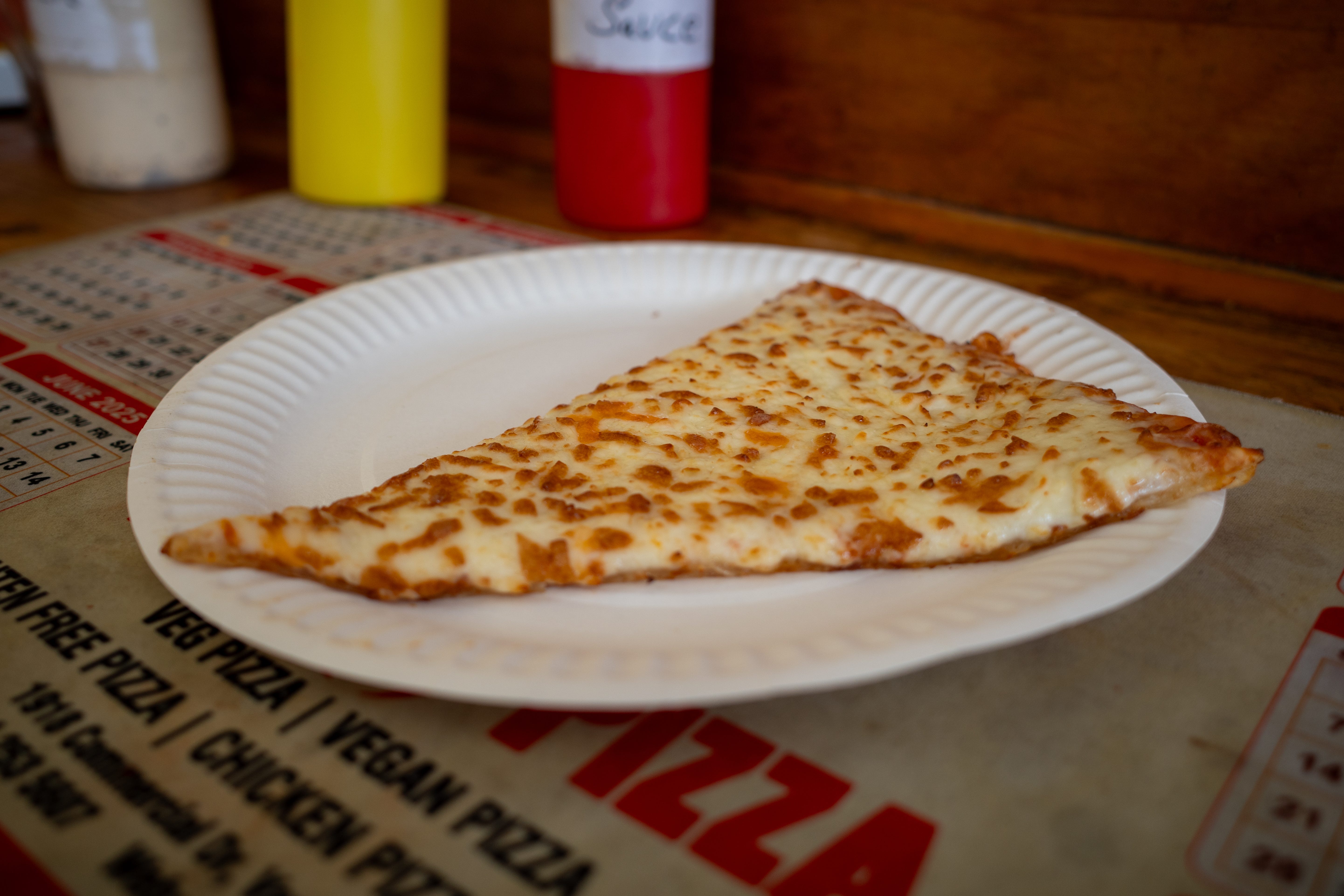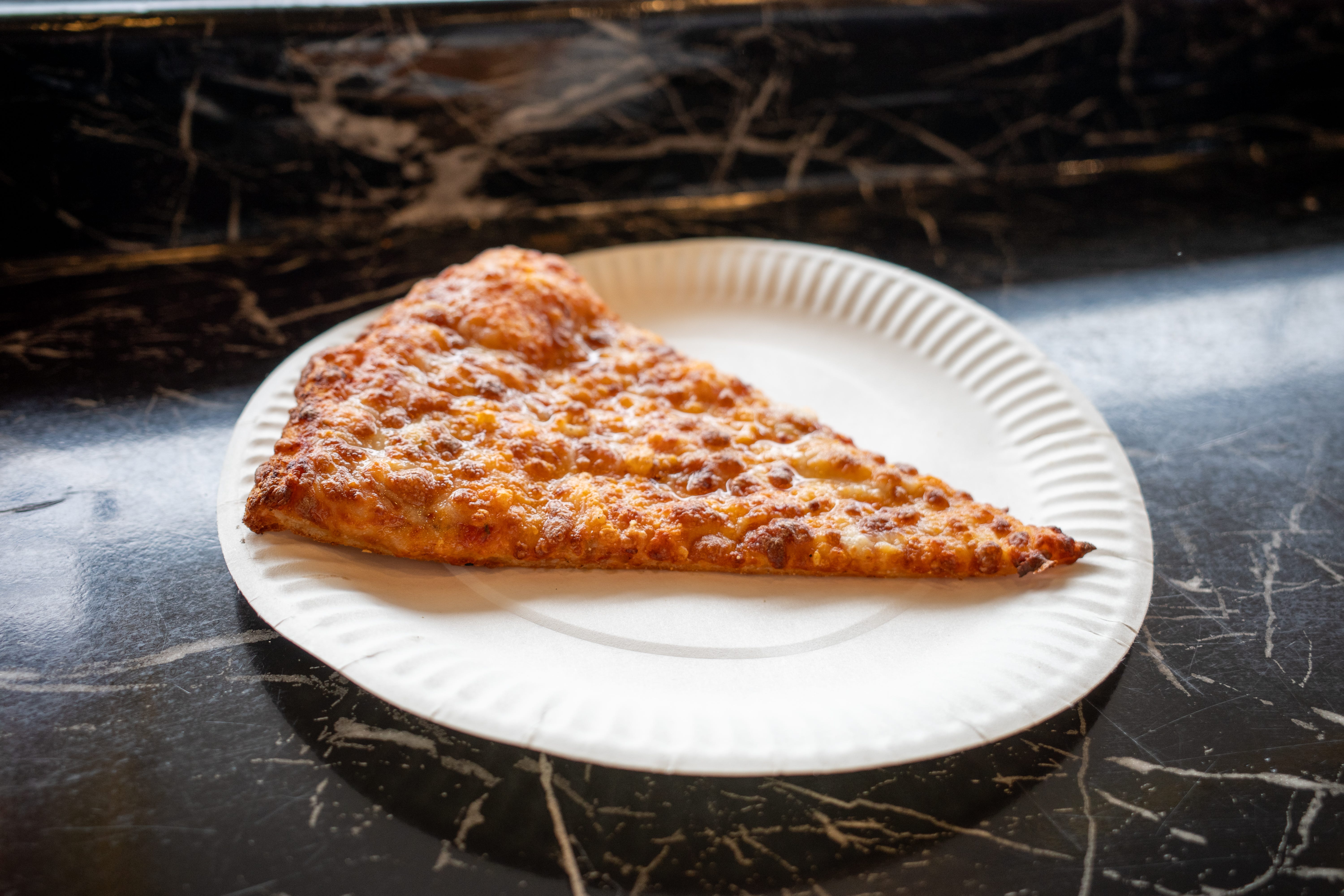 It should be fresh and well-cooked, with small bubbles or light browning. Too much cheese will overpower the slice, too little feels like a mistake.