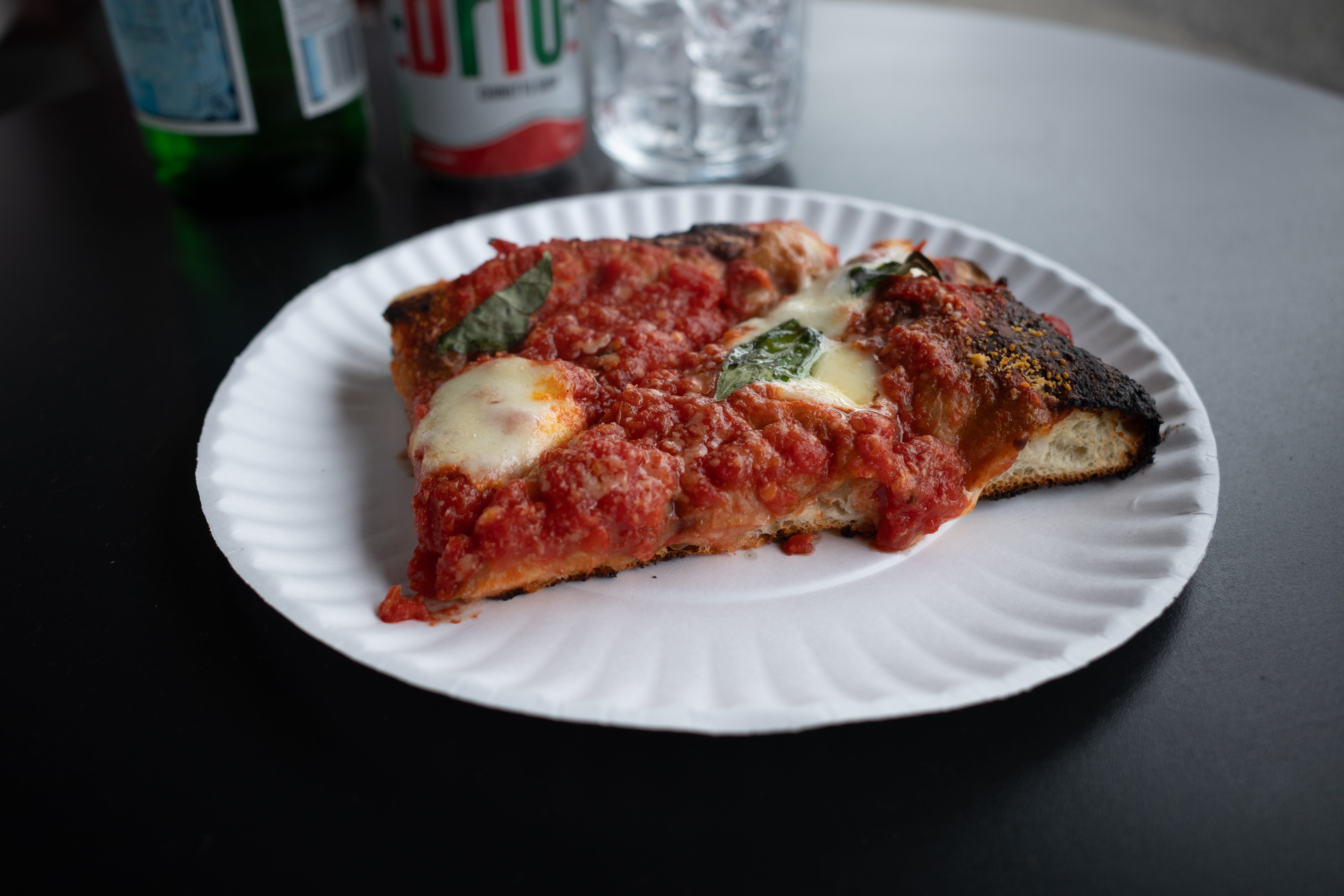 A clean, new-school hybrid slice that tries to bridge Neapolitan and NY with some success. The bitterness from the crust (happens when cooking HOT) didn’t ruin it, but once you noticed it, it lingered.